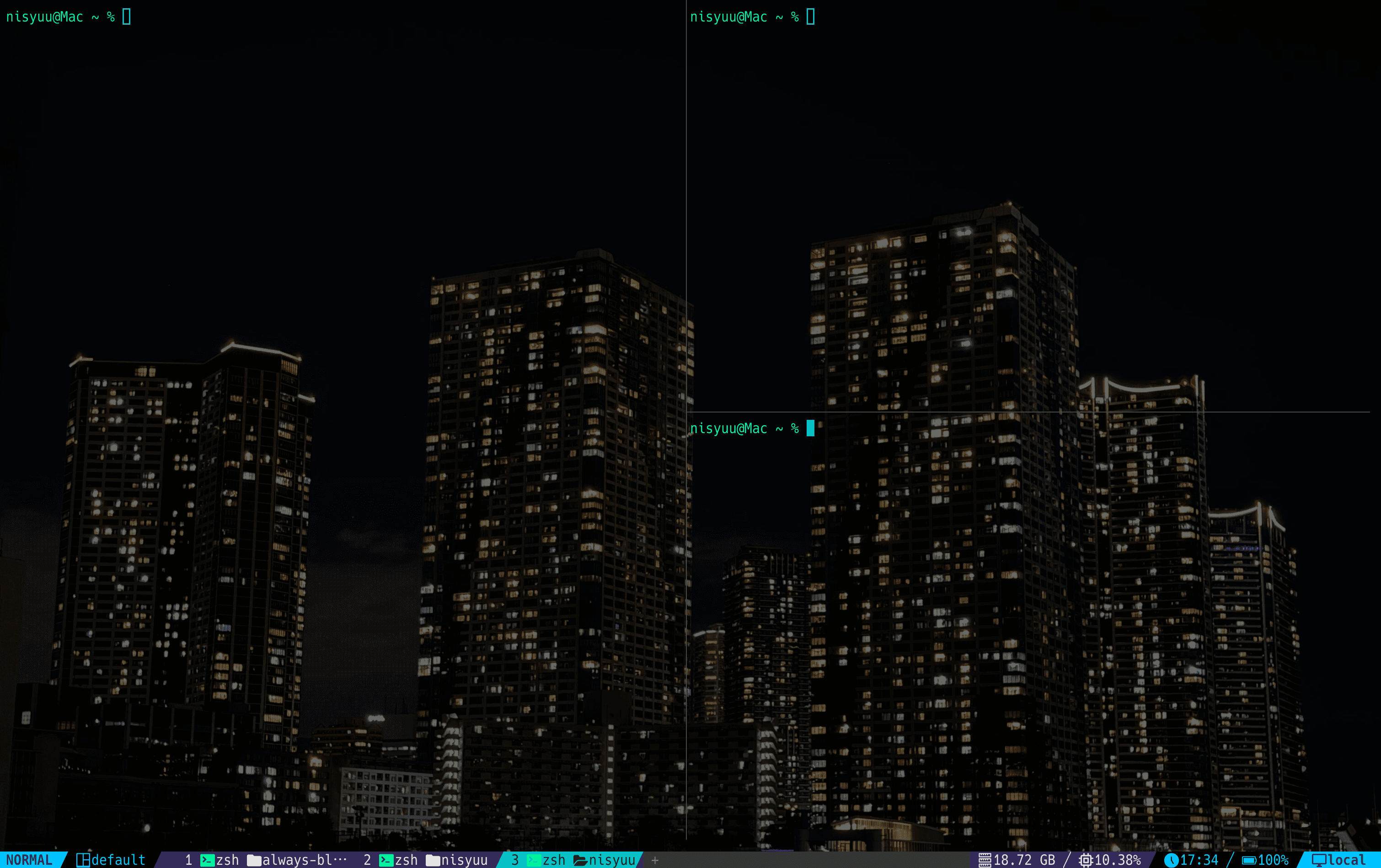 フォントはHackGenを使用している。local tabline = wezterm.plugin.require("https://github.com/michaelbrusegard/tabline.wez")はWezTerm用のプラグインでターミナル下のバーがタブ、メモリ使用量、CPU利用率、時刻などが表示される。config.backgroundで背景画像を設定でき、明るさ、再度、色相を指定することで見やすさを調整できる。config.leaderやconfig.keysはキーバインドの設定となっている。