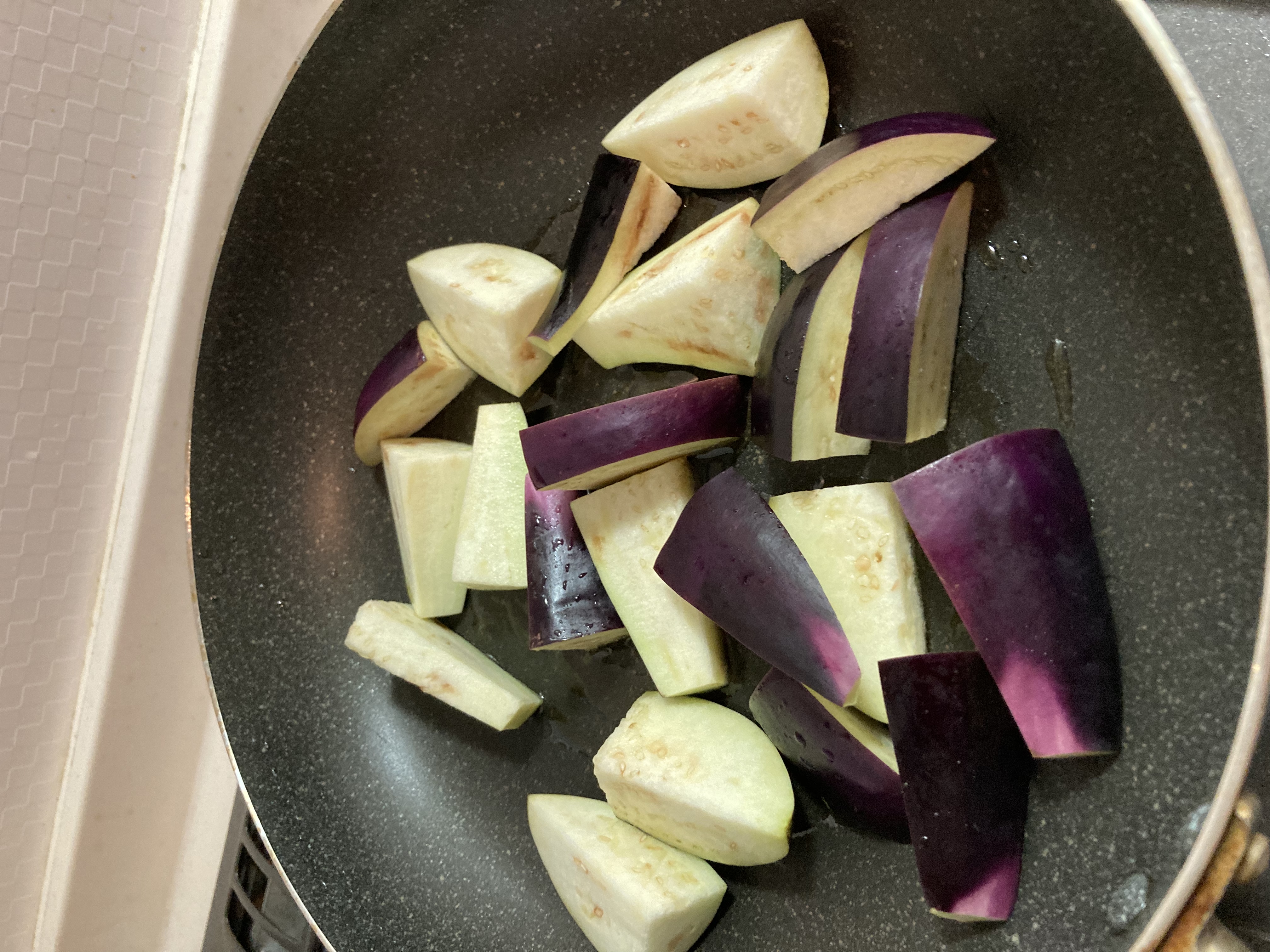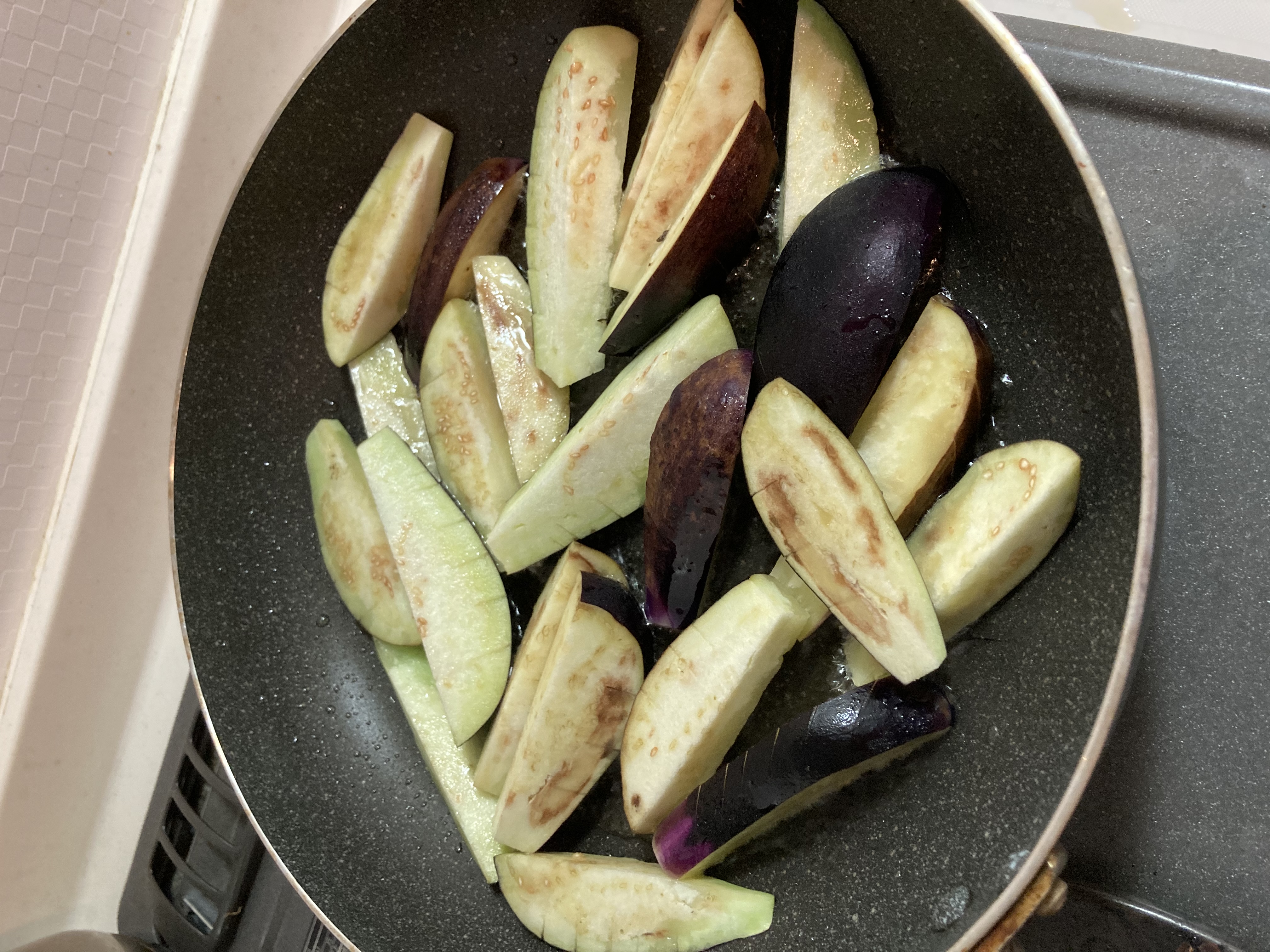 フライパンにごま油を熱し、、ナスを加え焼き色を付けながら焼いてください