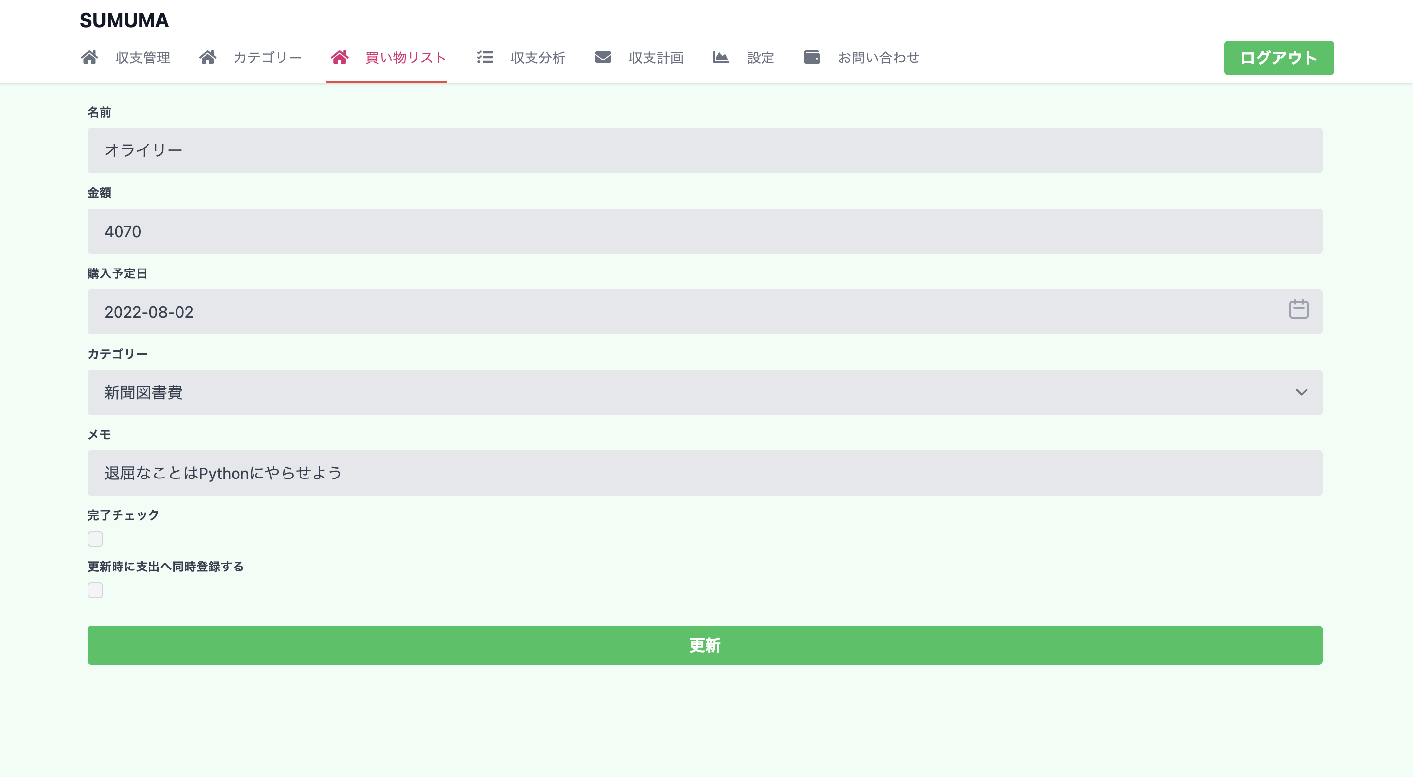 上画像が買い物リストの編集画面なのですが、「更新時に支出へ同時登録する」にチェックを入れて更新すると支出へ登録されます。