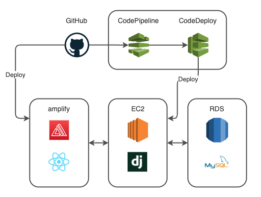 biby diaryはReact+TypeScriptとDjangoで開発しました。サーバーはAWSのものを使用しており、フロントエンドにはamplify、バックエンドにはEC2を使用しています。 amplifyを使うことでURLのSSL化やデプロイの設定などを簡単に行うことができます。 ドメインはお名前.comで取得しているのですが、ネームサーバーをAWSに向けておけばCNAMEなどの設定も自動で行ってくれるので非常に楽でした。 バックエンドにEC2を使うことで、CodeDeployとCodePipelineを使って容易に自動デプロイの設定ができます。